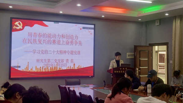 为深入学习宣传贯彻党的二十大精神,深刻领会会议的丰富内涵和精神实质,进一步将党的二十大精神内化于心、外化于行、落到实处。近日,研究生第二党支部开展学习宣传贯彻党的二十大精神专题党课。支部书记裘晨以“用青春的能动力和创造力在民族复兴的赛道上奋勇争先”为题,为全体党员上了一堂专题党课,引领研究生第二党支部全体党员以二十大精神为指引,踔厉奋发、勇毅前行,切实把学习成果转化为推动学院高质量发展的不竭动力。