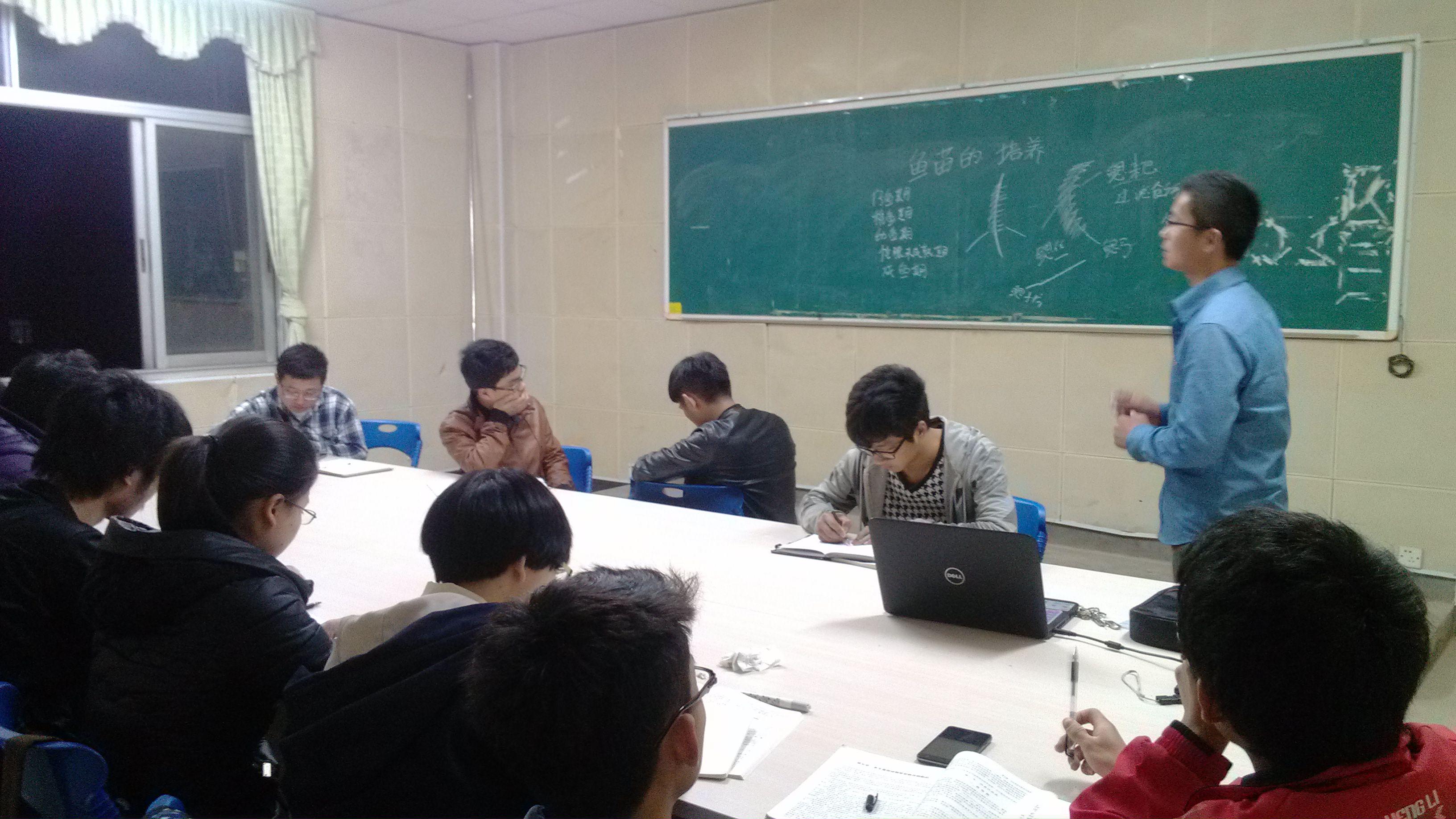 由于新加入小组的成员对于小组的日常工作还不是很了解,所以我们安排在每周周日晚上7点钟进行理论知识的讲解和小组例会工作。我们会邀请水产系研究生为我们讲解理论知识。目前我们已经安排了几次培训,如:常见观赏鱼的识别、鱼苗培养、浅析鱼病、热带鱼繁殖等等。通过理论知识的培训,小组新成员对小组日常工作可以得心应手,可以更好地把自己学到的东西应用到实践上来。(上图为老组员为新组员进行理论培训)