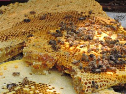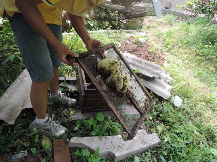 寺里去年冬天飞来了一群蜂,逐渐繁殖壮大了起来,虽然有很多蜜,但是由于缺少专业知识,寺中众人都束手无策,所以请我们前来帮忙。打开蜂箱,哇,好多蜜脾啊,看得我们两眼放光。忙请师傅给我们拿来了必要的绳子和脸盆。带上蜂帽,我们就开始干活了。小心翼翼的铲下蜂巢,用烟熏走上面的蜜蜂们。一片片仔细检查,认真筛选。小伙伴们分工作,不一会儿就有慢慢一盆的蜂蜜了。金黄金黄的,在阳光的折射下散发出甜蜜的气息。