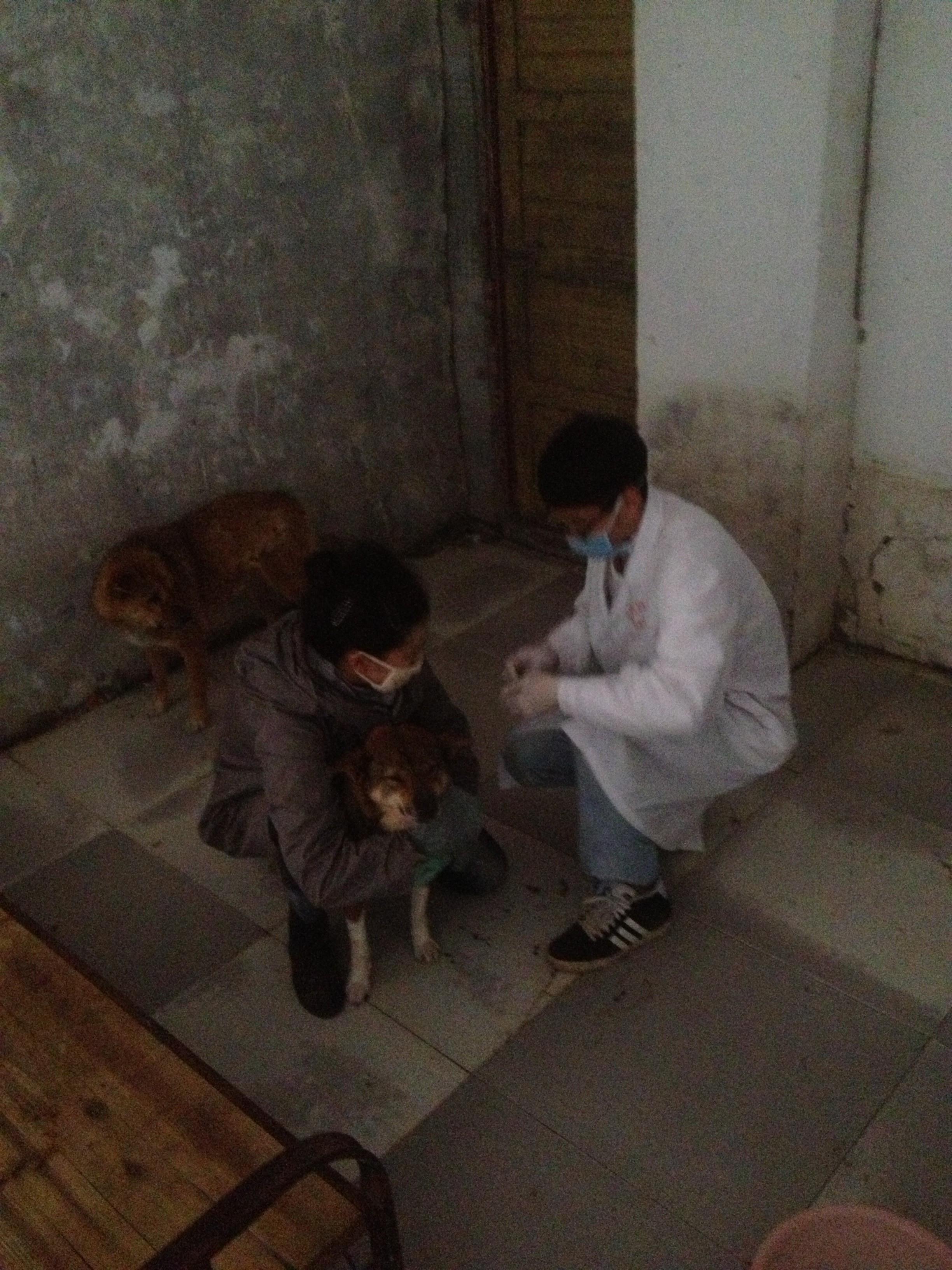一早,组长孟璞岩带领着组员到达了收容所,首先和所长朱女士进行交流,了解到收容所的概况和狗狗们近期的生活状况。然后,在朱女士的带领下参观了收容所并对所有的狗狗进行一定的接触和熟悉。接下来便为它们配制需要接种的疫苗和疫苗的接种。期间,许多狗狗还是会感到害怕而抗拒,但在组员们的耐心和爱心下,不但和很顺利地完成了为流浪狗狗接种疫苗的任务,还和狗狗们建立了友谊。