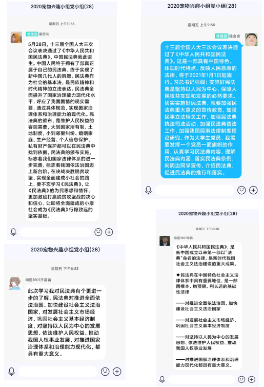 为深入学习宣传贯彻习近平总书记关于全面依法治国的重要论述,贯彻落实习近平总书记关于加强《民法典》普法工作重要讲话精神,准确把握《民法典》核心要义,扎实做好《民法典》学习贯彻实施工作,2020128日至20201211日,专业特色党小组带领宠物兴趣小组所有成员在线上学习《民法典》相关内容,并发表学习心得。