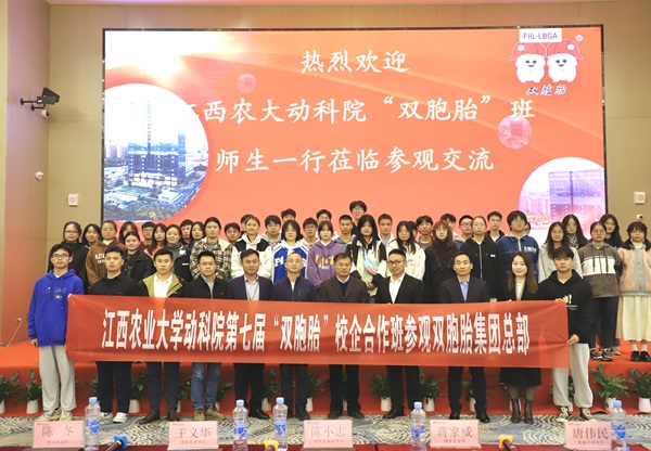 11月11日,第七届“双胞胎”校企合作班的学员们来到双胞胎集团进行参观学习。双胞胎集团招聘调配部部长石贺龙、集团养猪干部部部长唐伟民、添加剂采购部部长邹晓军、饲料与服务负责人熊杨辉出席活动并做经验分享,动物科学技术公司党委书记王义华、党委副书记陈小志、学工办老师陈冬和蒋家威,第七届“双胞胎班”成员及各员工代表参加,并现场推介毕业生应聘。