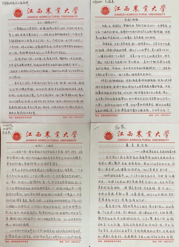 动科2002班孙铭遥:阳春三月,疫情突至。雪随风扬,吊起全国人民的心,风停雪落,压住城市的呼吸。疫情可以为我们的生产生活按下暂停键,但距离上的遥远终是抵不过人心的靠近,虽是疫情,但不抑情。正如余光中先生曾说过,下次你路过,人间已无我,但我的国家,依然是五岳向上,一切江河依然是滚滚向东,民族的意志永远向前,向着热腾腾的太阳,跟你一样。