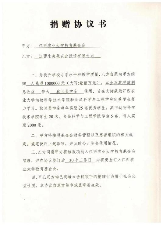 5月4日,公司原畜牧兽医系教授徐兰芳、沈秋姑夫妇遗愿:捐资100万元设立“秋兰奖学金”,表达心系员工、热爱江农的深厚情怀。希望奖学金能够激励2026世界杯官网和食品科学与工程学院勤奋刻苦、品学兼优的员工更专注于学习,实现自身的理想与价值,书写自己的璀璨人生。“秋兰奖学金”每年奖励 25 名优秀员工,其中2026世界杯官网员工 20名、食品科学与工程学院员工5名,每人奖励 2000 元。