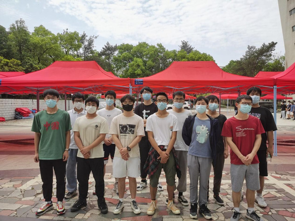 “我们先把这几个帐篷放到旁边”“那个角去一个人,大家一起把帐篷支起来。”在接到任务后,惟义动科2101班付坤同学第一时间报名,与志愿者们一起协助校团委搭建了二十余顶遮阳帐篷,解决了公司核酸检测场地的问题。