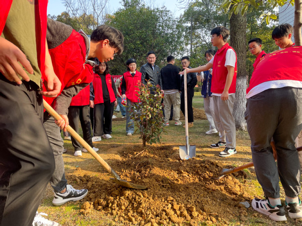 迎着春日的暖阳,踏着温柔的春风,师生们积极投身于添绿行动中。在一派热火朝天中,师生们纷纷“撸起”袖子,有力地挥舞着铁锹,铲土、填坑、踩实,现场沉浸在一片欢声笑语中。经过一个小时的紧密配合,一株株小树苗被细心地栽种,在“俊秀林”中“安家落户”,树苗们笔直地迎风伫立,连成春日中最富生机的一抹绿。