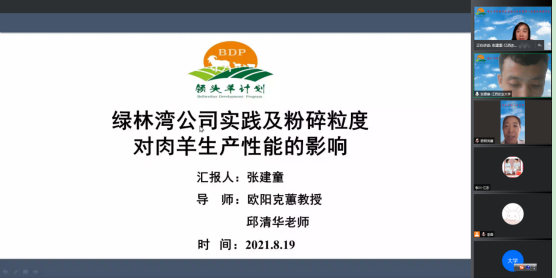 会上,公司动物营养与饲料科学硕士研究生张建童、孙梦雪分别做《绿林湾公司实践及粉碎粒度对肉羊生产性能的影响》、《烟酸对低pH诱导瘤胃上皮细胞凋亡的保护机制研究》报告。