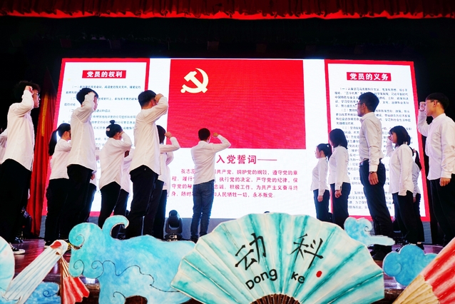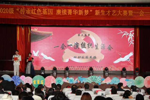 此次“一会一演”组织生活会紧紧围绕“感念党恩泽,情系新使命”主题而展开,员工党员以歌伴舞、情景剧、诗朗诵等多样的表演形式进行演绎。歌伴舞《美丽中国梦》拉开了晚会的序幕,尽展“砥砺中国梦,奋进新时代”的时代旋律;《最美逆行者》情景剧带领同学们走进抗击疫情的艰难时期,为我们展现了疫情期间最基层党员及医护人员“舍小家,为大家”的伟大抗疫精神;诗朗诵《扬国魂,颂赞歌》将烈士的大无畏精神,抗美援朝的爱国主义精神,对祖国和党的忠诚、对人民的承诺深情地演绎出来;40名新发展的员工党员上台进行了入党宣誓仪式,在红色党旗下,观众席全体起立,场上全体党员重温入党誓词。