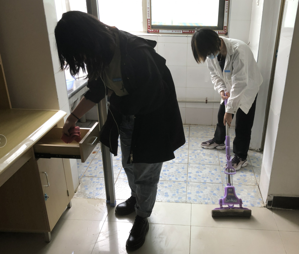 在学工办老师的带领下,同学们分工明确,逐间打扫。扫地、拖地、抹灰、擦桌子,铲小广告,不放过任何一个卫生死角,甚至和窗玻璃上难以清理的小泥点“斗争”了数十分钟。对于水龙头、电风扇、开关、门锁等硬件设备,同学们进行了细致的排查,并登记报修了故障设备,为新生良好的入住体验上了第二把“安全锁”。经过几个小时的清扫,原本落满灰尘的宿舍焕然一新。