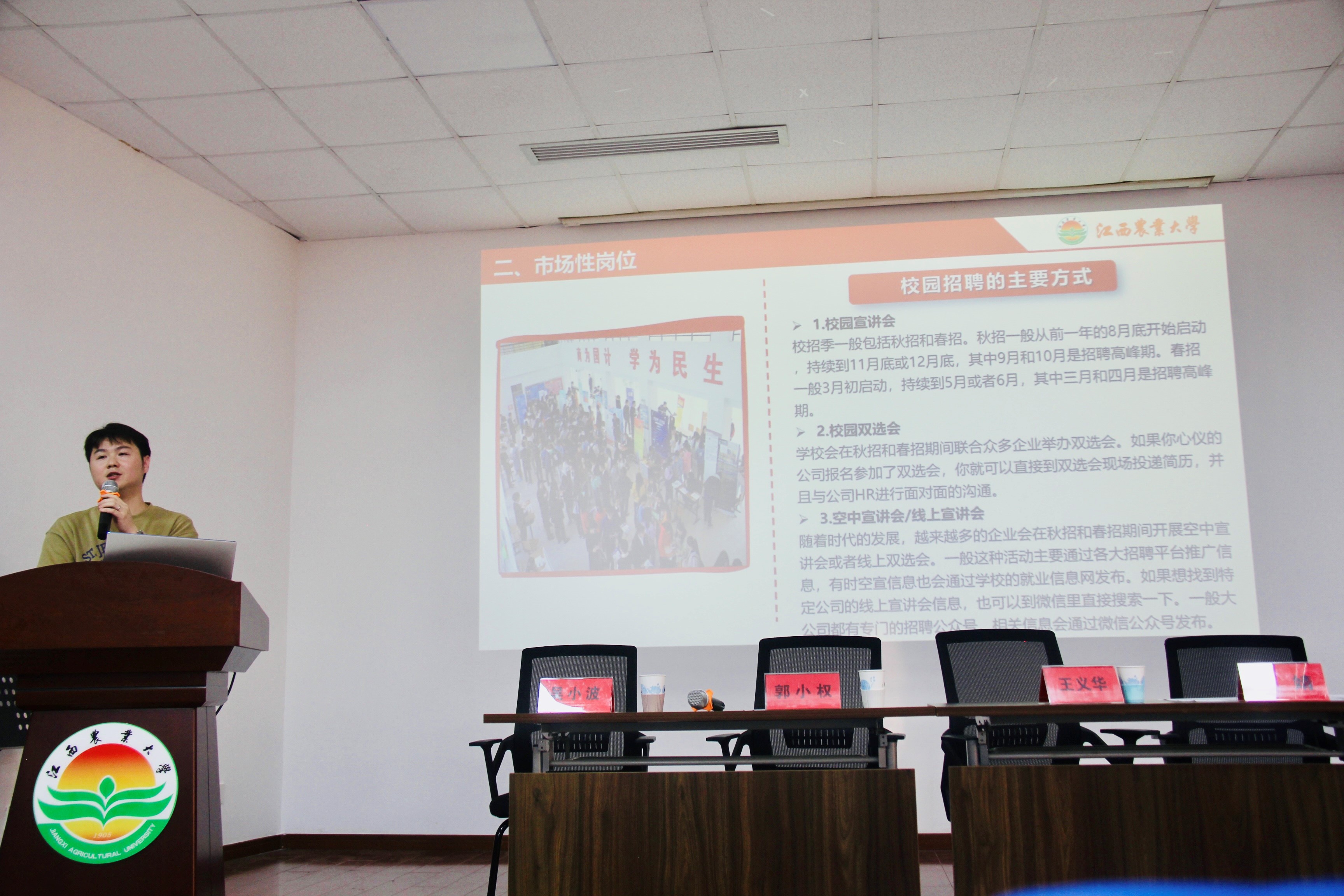 其次,强调在当前就业形势下,了解并把握春、秋季校园招聘的重要性。介绍了企业的招聘流程、岗位需求、薪酬福利、晋升机制以及针对应届毕业生的专项培养计划等内容,并就毕业生关心的三方协议、应届毕业生身份等问题进行解读。