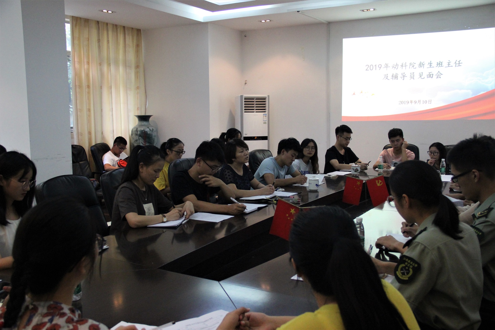 为加强新生班主任与辅导员之间的交流,做好迎接2019级新生的准备工作,9月10日,公司于学院二楼小会议室召开2019级新生班主任及辅导员见面会。公司党委副书记廖述香、2019级新生班主任、学工办全体老师、新生辅导员及全体教官到场参加。