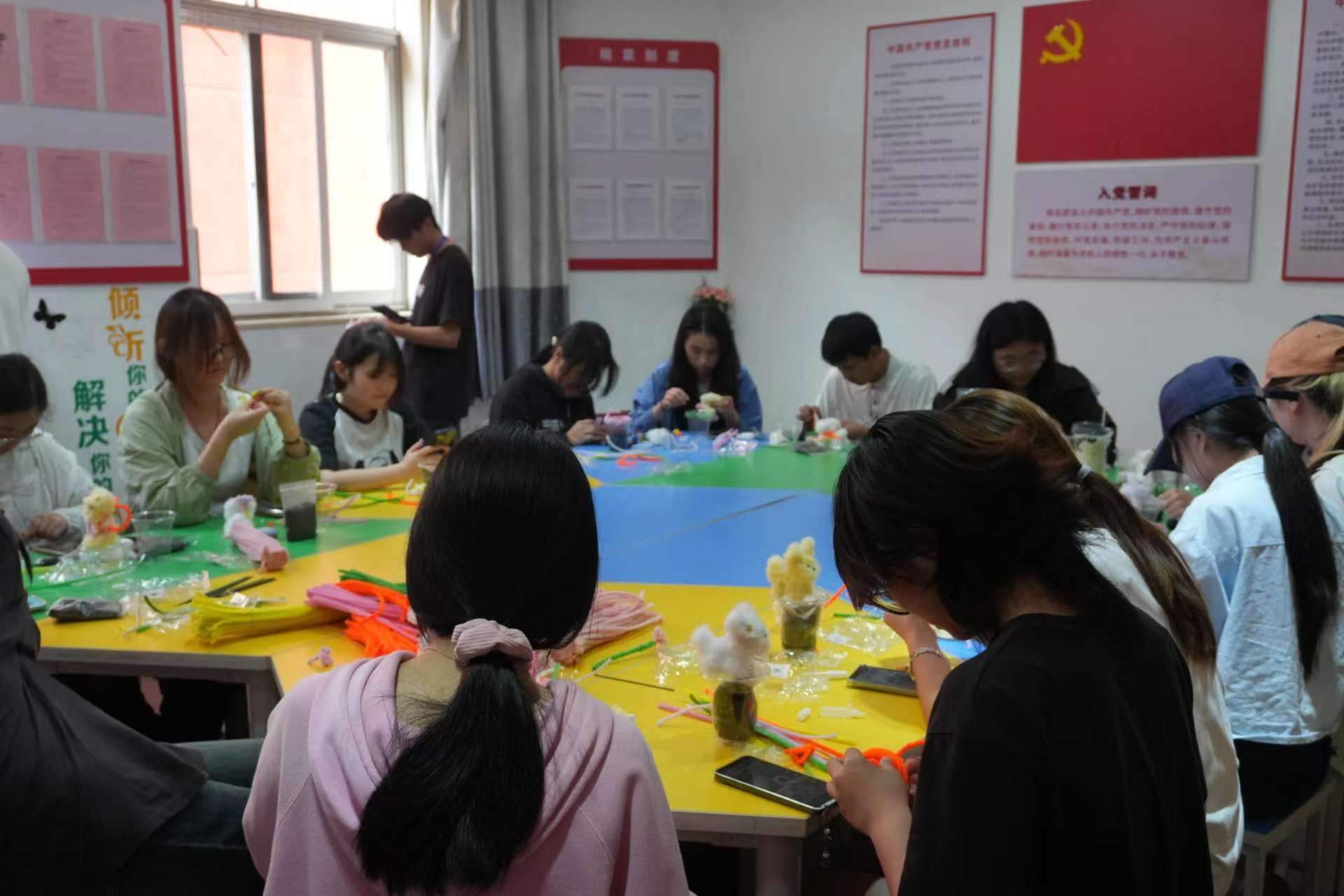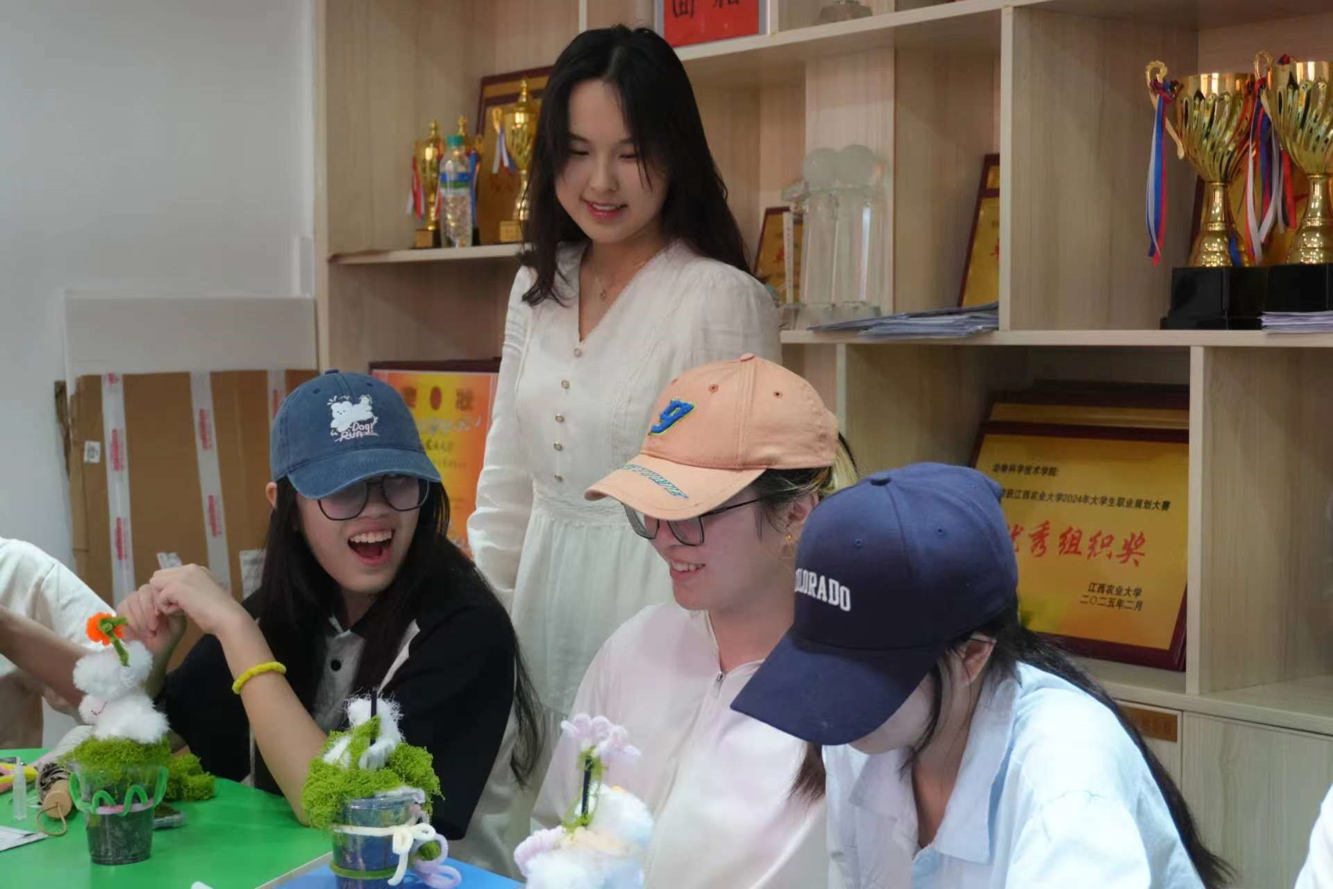 活动伊始,心理朋辈部工作人员向参与活动的同学们详细介绍了扭扭棒的基本制作技巧和注意事项,并展示了部分精美成品,激发同学们的创作灵感。随后,工作人员依次分发彩色扭扭棒、泥土等手工材料包。参与者们充分发挥想象力和创造力,运用彩色扭扭棒制作出小狗、小熊等栩栩如生的萌宠模型,并装饰于绿植培养杯中,形成独具匠心的“萌宠护新芽”创意作品。在近2个小时的制作过程中,同学们通过触摸柔软的绒毛材质有效缓解了焦虑情绪,在轻松愉悦的氛围中互相交流分享。活动结束后,同学们手持作品与《动物解剖学》《动物组织学与胚胎学》等专业课本合影,传递“寓学于乐、减压赋能”的积极心态。