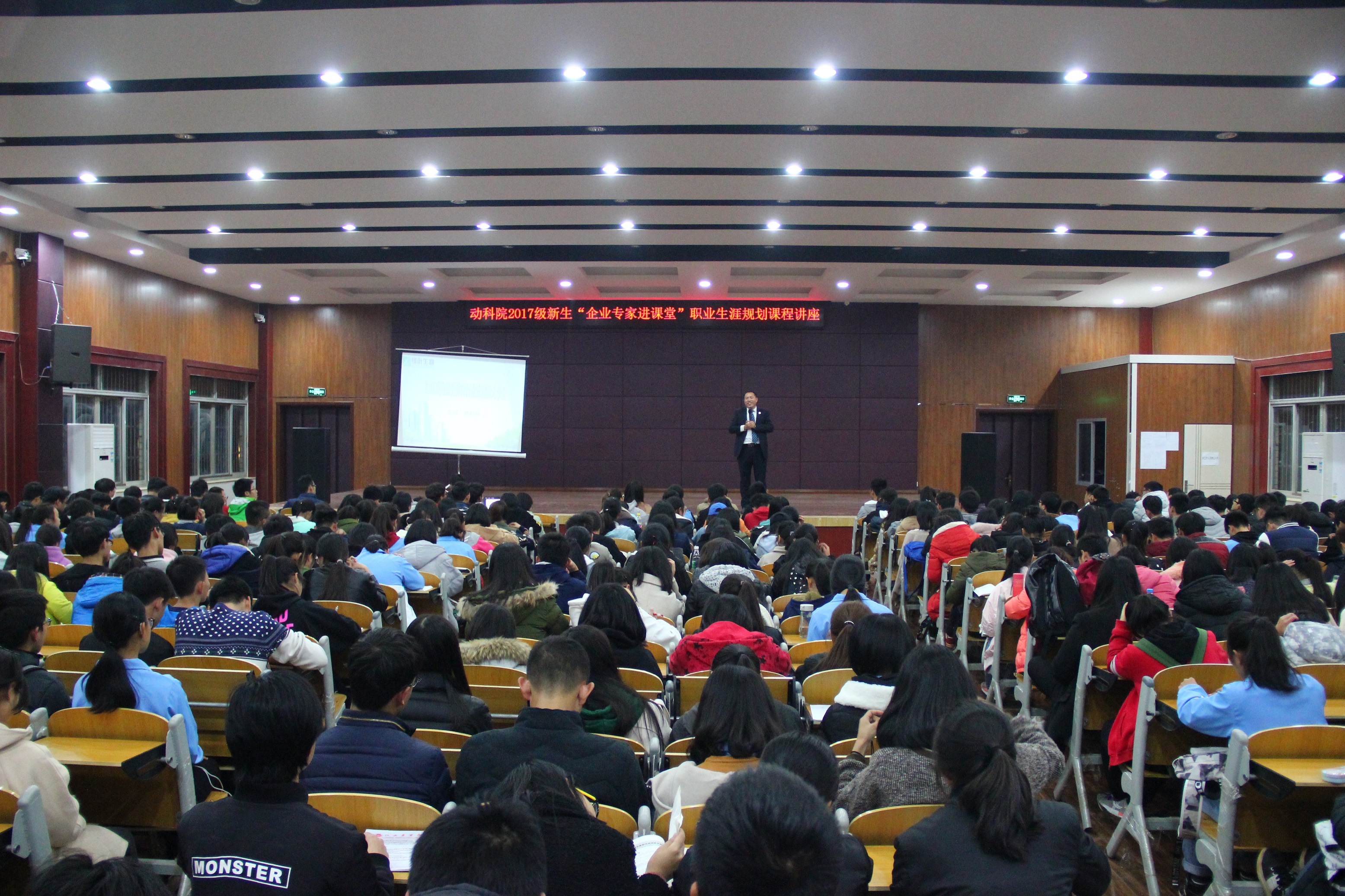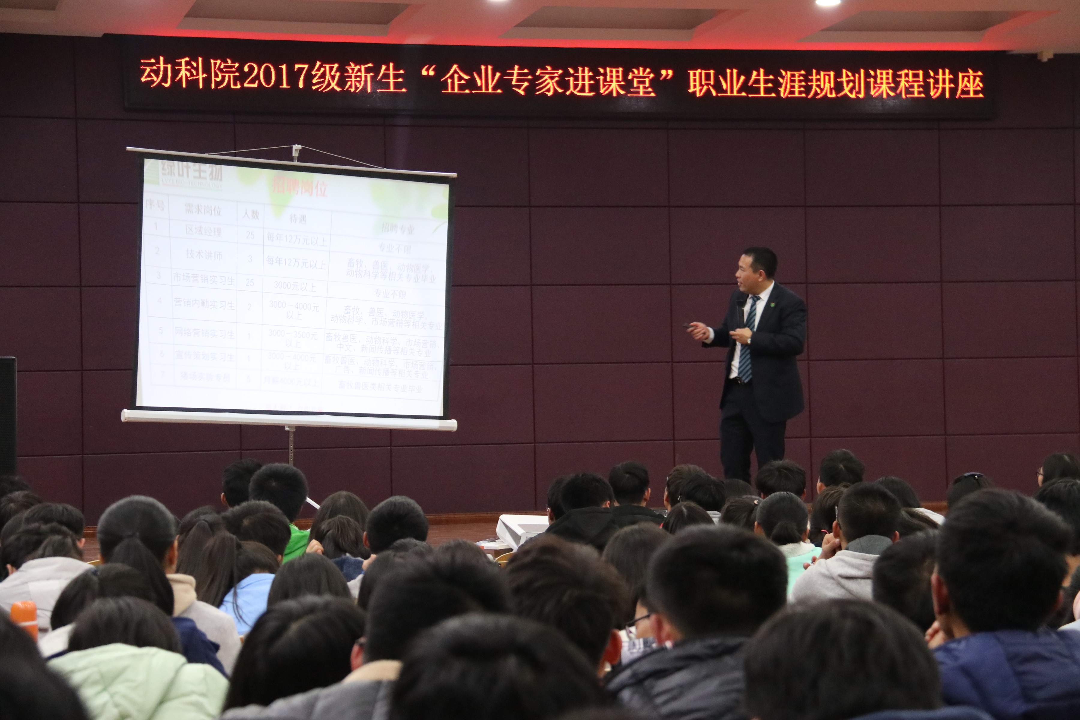 此次讲座邀请了湖南长沙绿叶生物科技有限公司人力资源总监童松林。他结合当前畜牧行业现状、企业人才需求及老员工职业规划意义等内容为2017级新生讲授了一堂题为《如何成为深受养殖行业欢迎的老员工》的课。以人才培养与职业生涯规划间不可分割的关系为切入点,为2017级新生讲授了人才培养与职业生涯规划的重要性。同时为新生讲述了现代畜牧养殖业的发展现状,以食品质量安全、生态规模养殖为例讲述了企业需求人才的标准,希望动科院2017级员工做好职业规划,学好专业知识,提升专业技能,才能在未来的职场制胜,才有能力为现代畜牧业做出贡献。