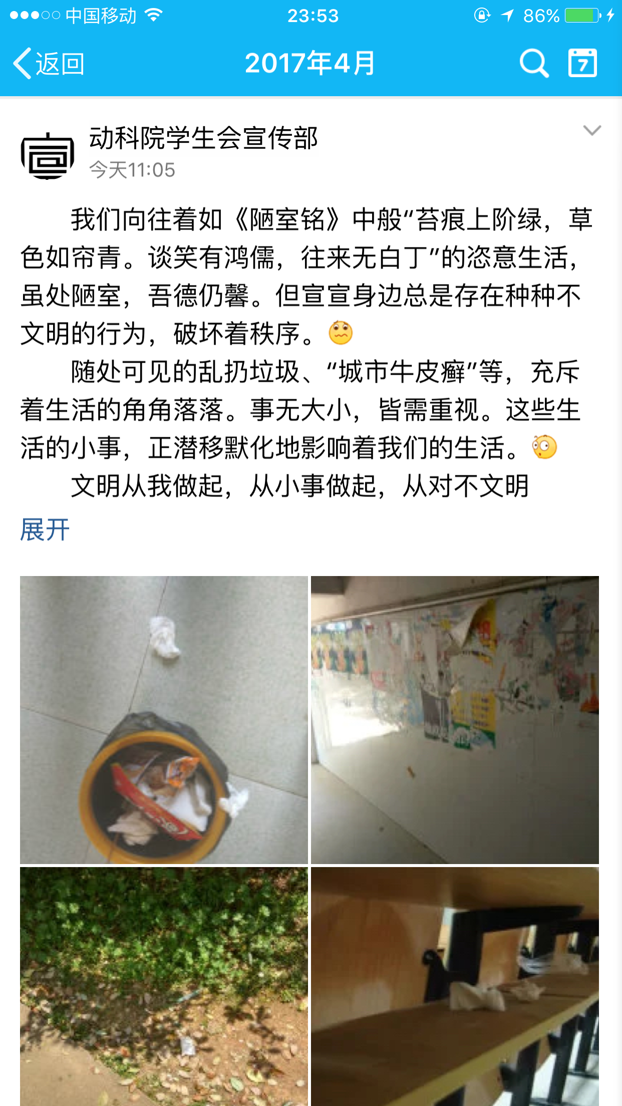 本周公司组织开展了不文明现象拍摄收集活动,发现较多同学文明意识仍不够强烈。此次活动收集的照片主要由公司员工会宣传部拍摄,现已在学院微博、微信和QQ等公众平台同步更新。