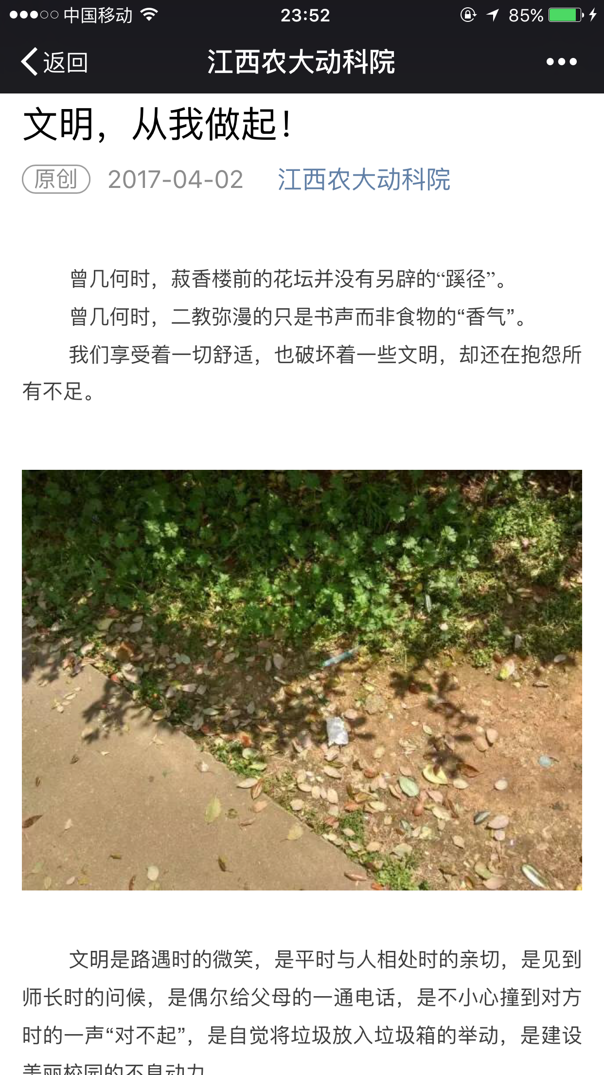 文明是路遇时的微笑,是平时与人相处时的亲切,是见到师长时的问候,是偶尔给父母的一通电话,是不小心撞到对方时的一声“对不起”,是自觉将垃圾放入垃圾箱的举动,是建设美丽校园的不息动力。
