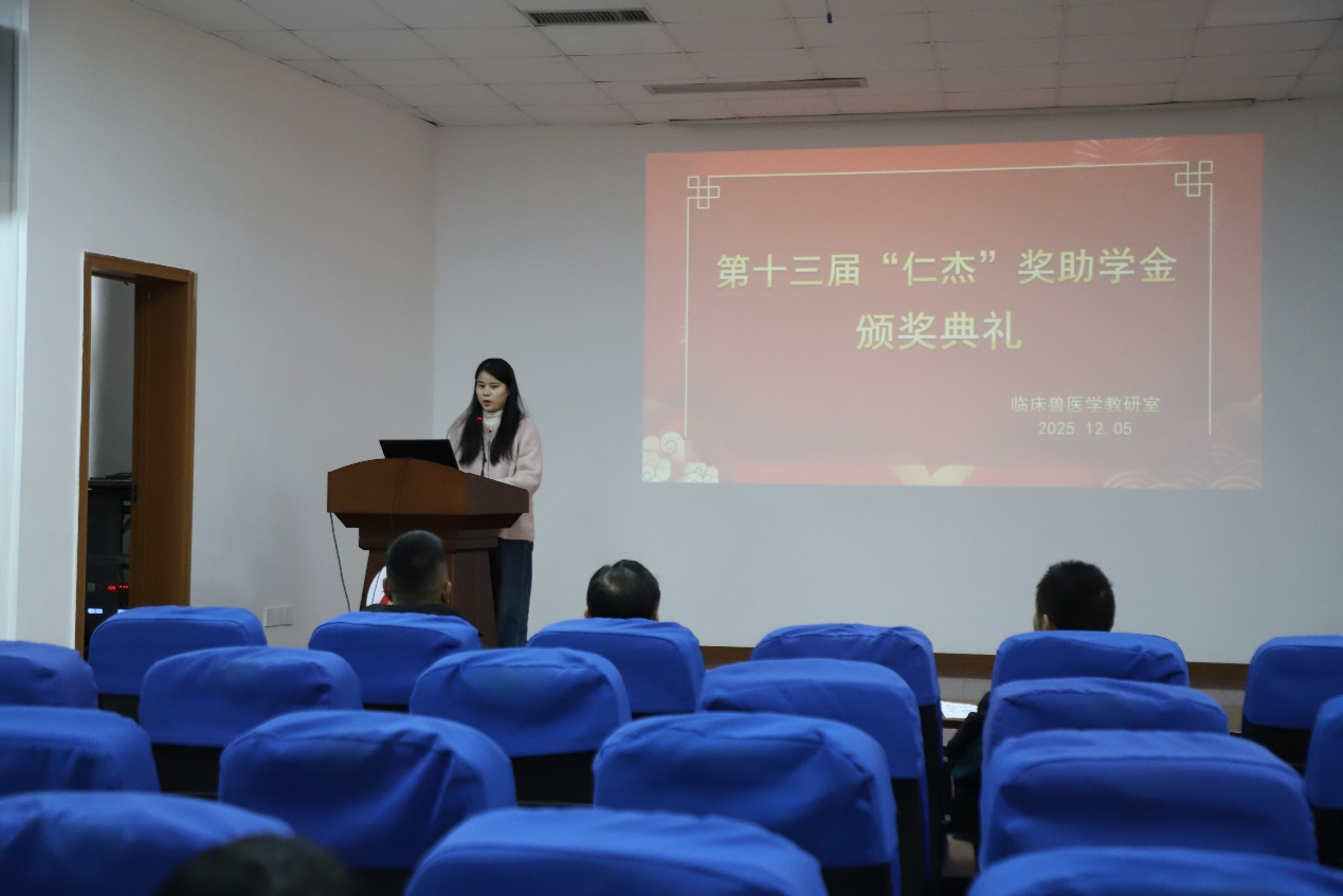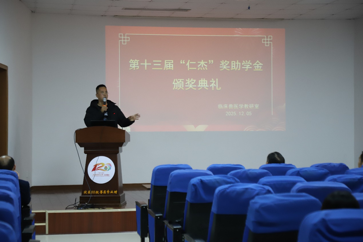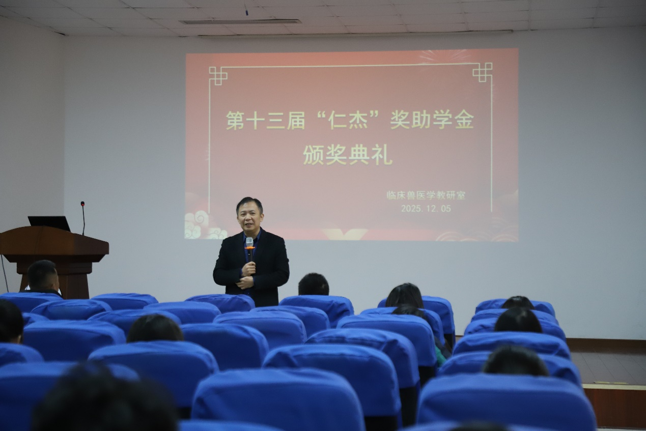 近日,2026世界杯官网第十三届“仁杰奖助学金”颁奖典礼在院201会议室举行。研究生院经理郭小权教授、动科院副经理吴小波教授、2013届临床兽医学杰出员工匡俊先生及临床兽医学学科全体师生参加典礼。