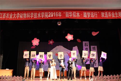 晚会分为书生意气、风华正茂和前程似锦三个篇章。一首《BangBangBang》作为开场舞瞬间点燃全场。歌曲《江农的日子》唱出了老员工活的点点滴滴,有苦有乐;原创情景剧《窗外阳光》演绎出了学子对母校生活的依依不舍;随后的师生朗诵中,毕业班班主任们带来的离别寄语感动全场,将现场气氛推向高潮。毕业生们纷纷上台献花表达对母校、老师的感恩与不舍。最后,晚会在一首《红日》中圆满落幕。