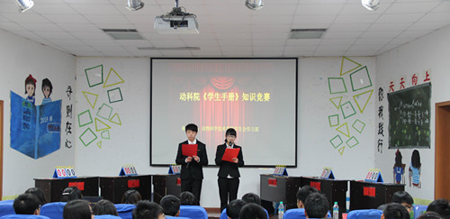 经过初赛的笔试,共有六个班级18位选手晋级决赛,决赛分为班级赛和个人赛两个部分。在第一轮必答题环节中,选手们胸有成竹,各领风骚。随后的抢答题环节,凭借灵敏的反应和果敢的判断,动医1402班脱颖而出率先晋级,动医1403班和动科1401班也都成功挺进了比赛第二轮。在"我们来找茬"和"大冒险"两个环节,新颖的比赛形式充满挑战,现场气氛也愈发紧张。选手们斗智斗勇,最终动医1402班摘得桂冠。全新的"一站到底"个人赛部分,8个新生班级分别派出一名代表进行攻擂式对决。经过一番激烈的比拼,来自动医1403班的陈聘聘同学力战群雄,荣获"知识手册达人"奖,动科1401班获最佳组织奖。