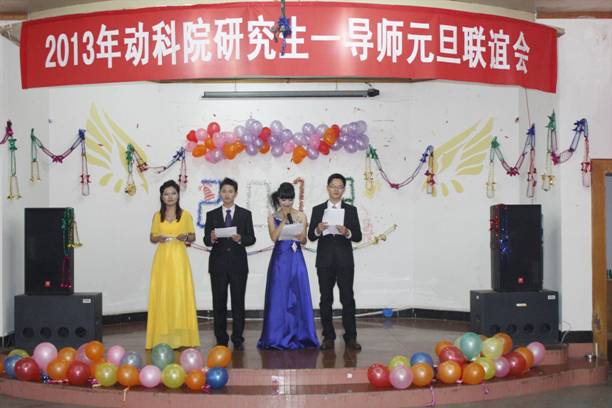 12月28日下午,在新年即将到来之际,公司“2013年研究生—导师元旦联谊会”在校工会俱乐部隆重举行。校研究生处处长曾志将、党总支书记熊红华、教务处处长何后军、图书馆馆长胡国良、动科院经理瞿明仁、党委书记陆伟、副经理游金明出席联谊会。瞿明仁经理和熊红华书记分别代表学院和研究生处致新年贺辞。