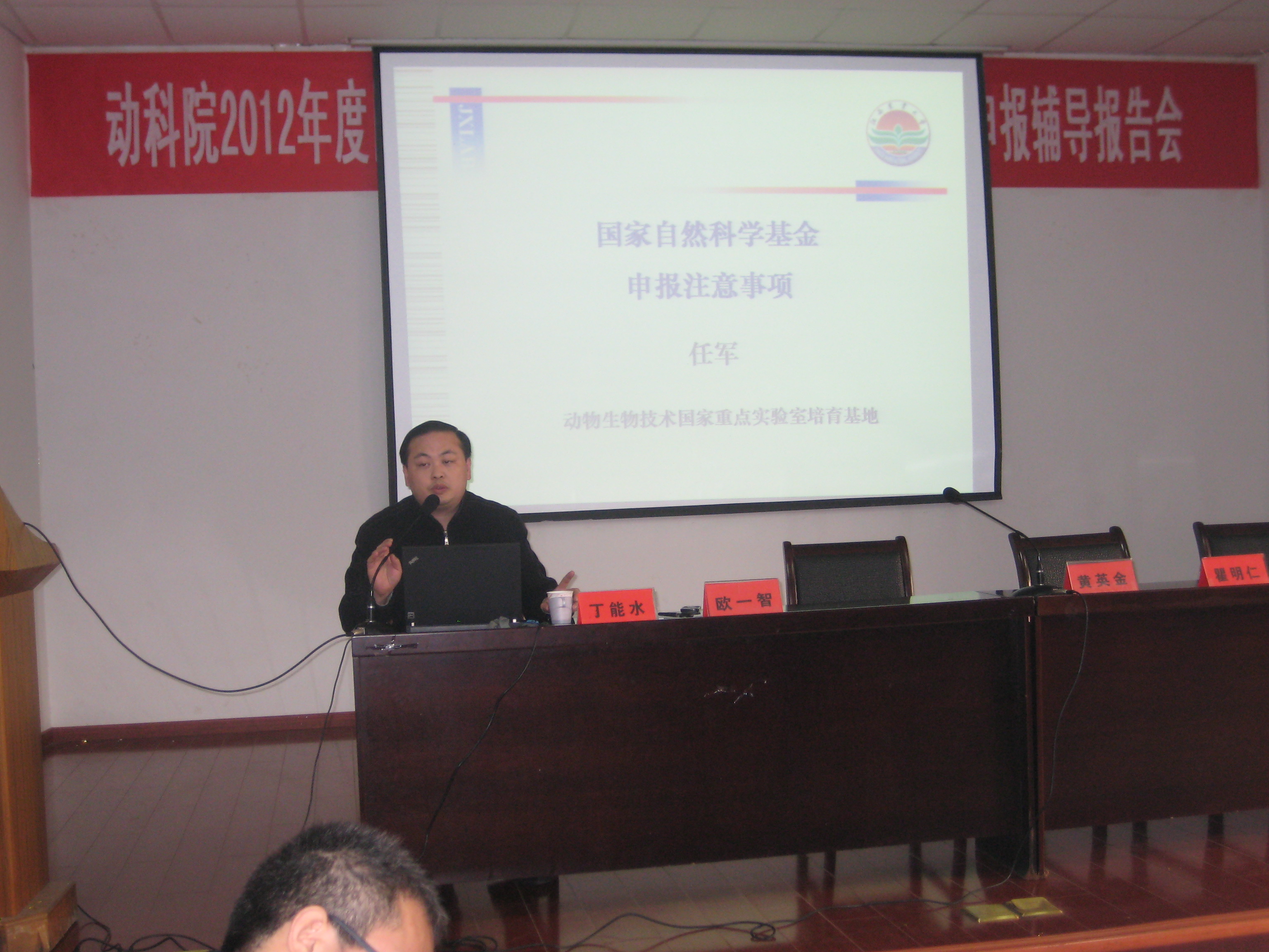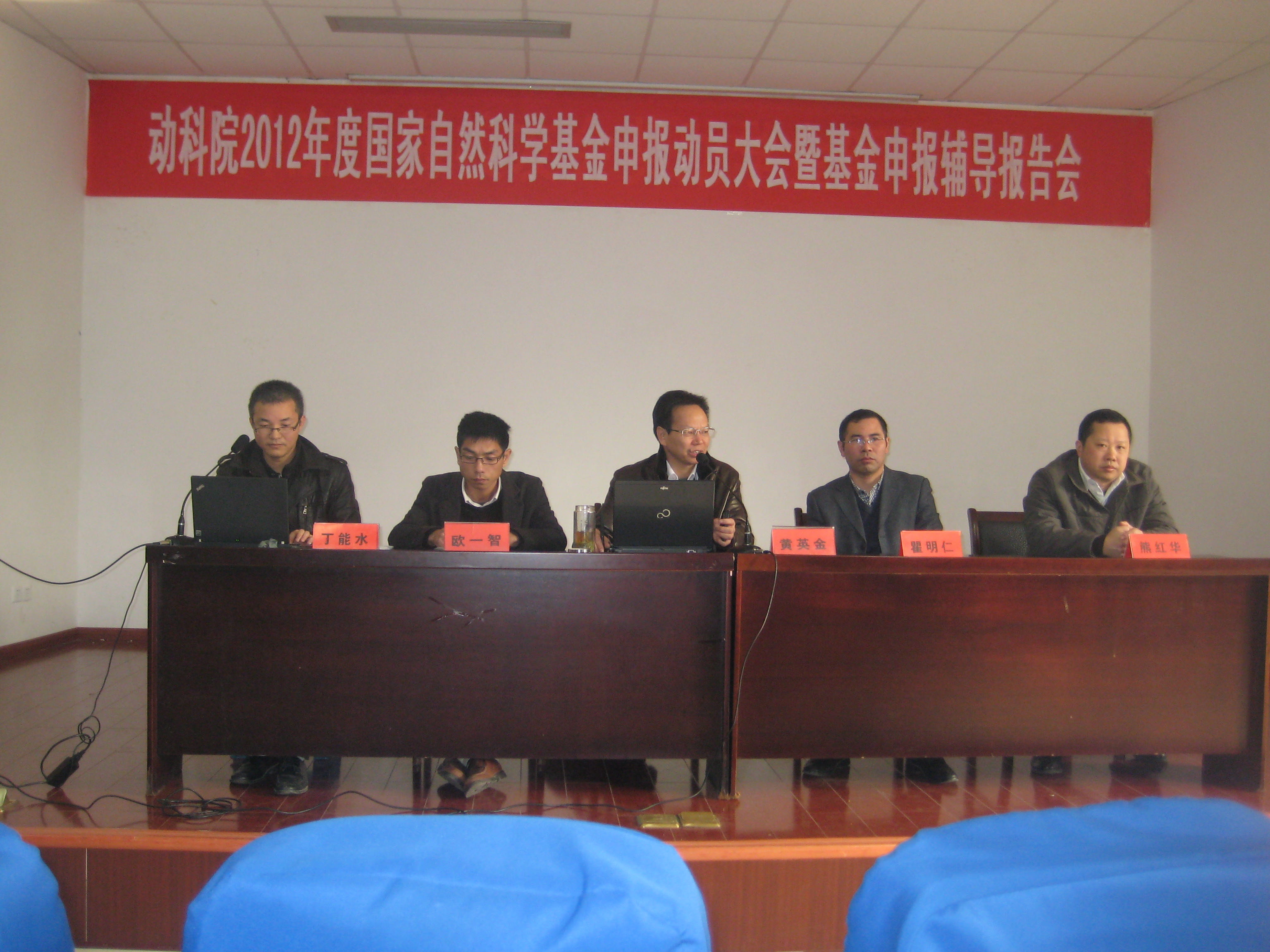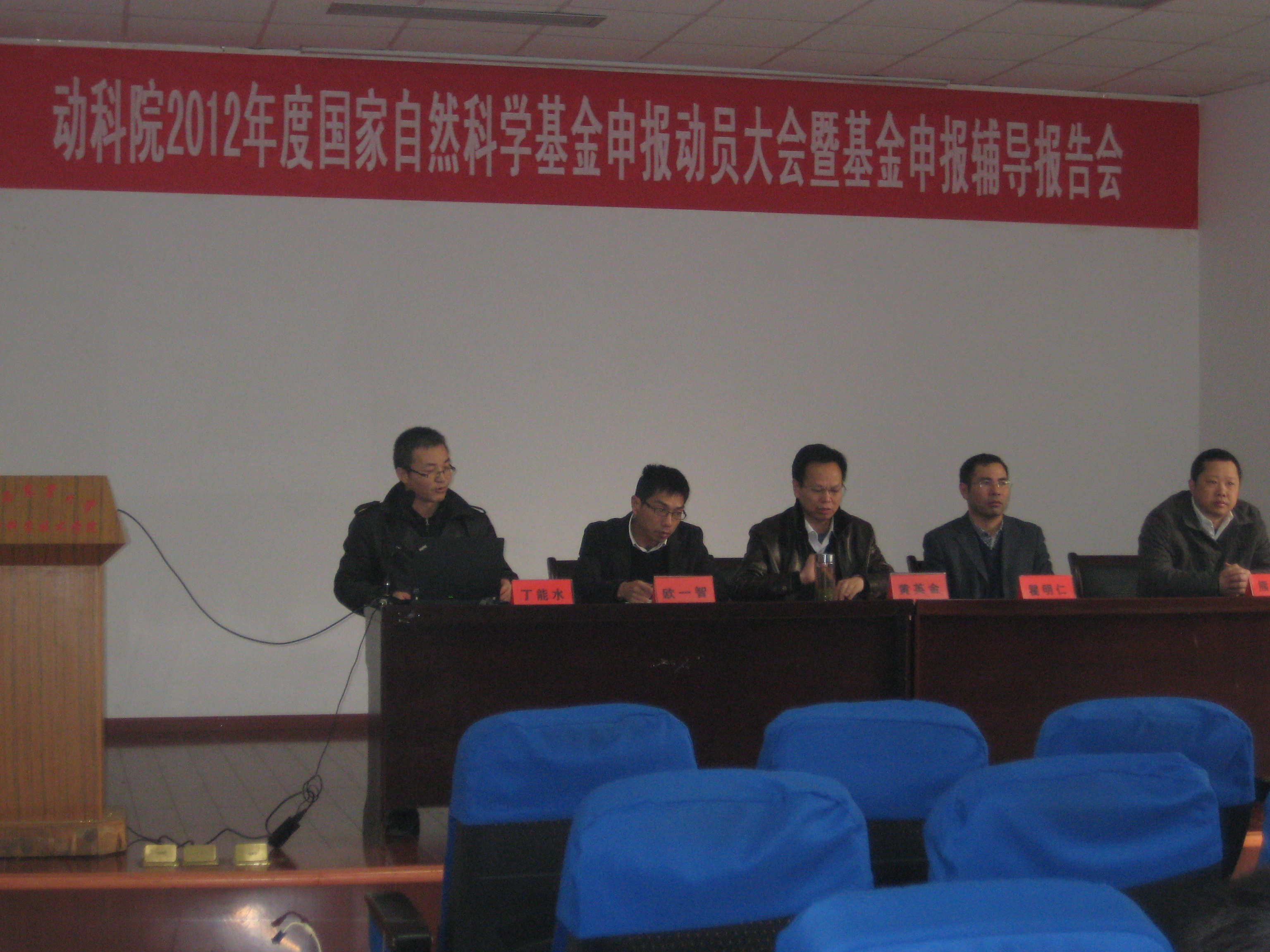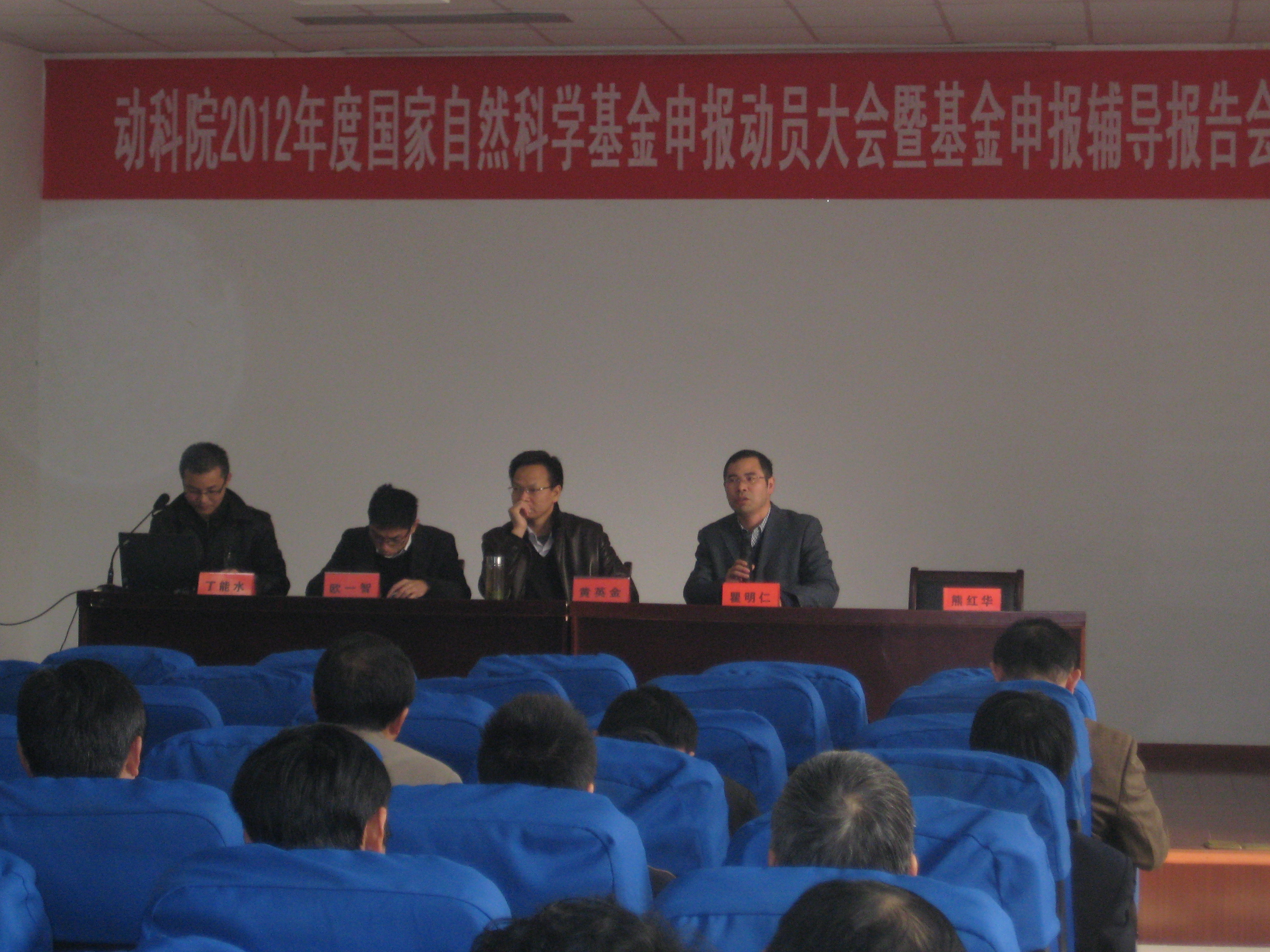 2011年12月6日,在动科院报告厅隆重举行了2012年度国家自然科学基金申报动员大会与基金申报辅导报告会,出席会议的有校科技处处长黄英金、校科技处欧一智、动科公司党委书记熊红华、经理瞿明仁、副经理陆伟、游金明,会议由丁能水副经理主持,动科院全体老师积极参加。