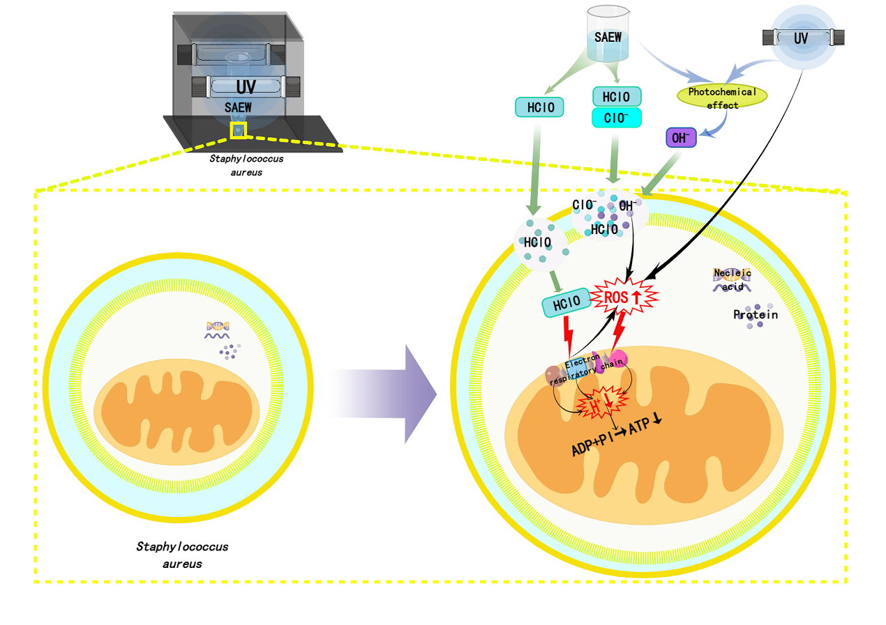 论文是团队在之前研究微酸性电解水和紫外线结合发生光化学效应,产生协同作用,可高效杀灭革兰氏阴性细菌沙门氏菌,并发现其杀灭机理的基础上,深入探讨该方法对革兰氏阳性细菌金黄色葡萄球菌的杀灭效果和机理,发现由于金黄色葡萄球菌结构与沙门氏菌不同,该方法对金黄色葡萄球菌的杀灭效果及机理与沙门氏菌存在差异。在杀菌效果上,其所需微酸性电解水有效氯浓度和处理时间均高于处理沙门氏菌。杀灭机理主要是:微酸性电解水联合紫外线处理对金黄色葡萄球菌的细胞膜造成一定程度损伤,包括细胞膜的电导率增加,胞内ROS水平提高和细菌线粒体功能降低,但未引起核酸和蛋白质的泄漏。
