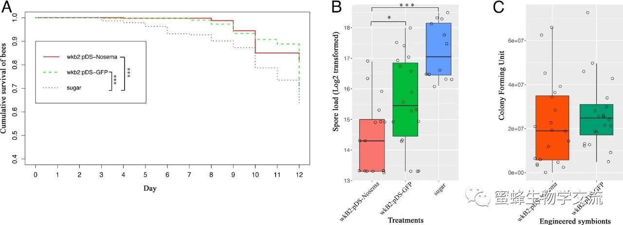 微孢子是对蜜蜂危害最大的体内寄生虫,可直接导致蜂群瓦解。烟曲霉素曾是治疗微孢子感染的主要药物,但由于长期使用,微孢子已经对其产生抗性。Snodgrassella alvi是贴靠在蜜蜂肠道壁的共生菌,对蜜蜂生长发育和免疫应答起重要调节作用。该论文运用合成生物学,将微孢子关键基因部分DNA导入该共生菌。在共生菌增殖过程中,释放出大量dsRNA,抑制微孢子繁殖,并延长蜜蜂寿命。改造后的共生菌在蜜蜂个体间快速传播,可形成群体免疫。该研究成果解决了外缘dsRNA制备价格昂贵且不稳定的难题,为蜜蜂病虫害防治提供新思路。