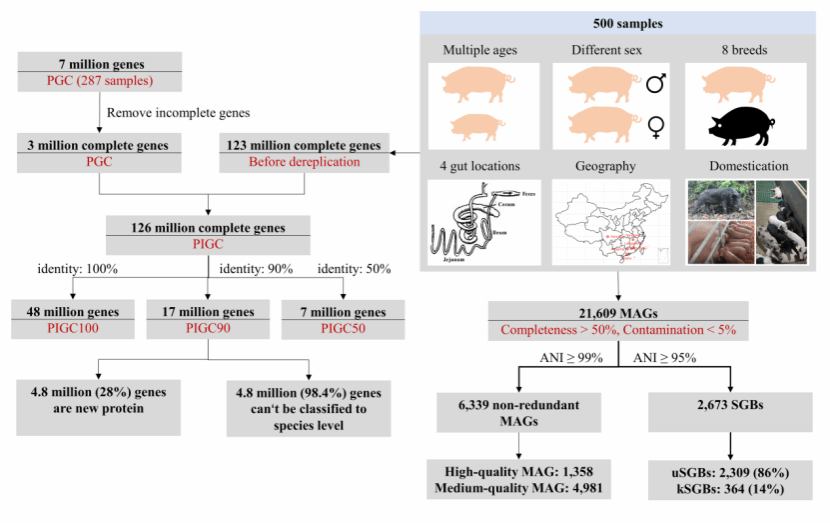 在这项工作中,黄路生院士及学校首席教授陈从英带领团队通过对来自不同年龄、性别、品种、地理区域、不同肠道部位和野猪来源的500个样本,进行深度宏基因组测序,并整合了现有的猪肠道菌群基因组,构建了一个目前为止较为完整的猪肠道微生物基因目录和基于宏基因组组装的基因组。尤其是野猪肠道菌群样品以及空肠、回肠和盲肠内容物样品的使用,增强了PIGC和MAG的广泛代表性。