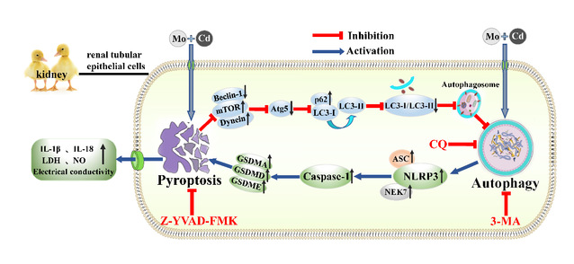 在国家自然科学基金项目的资助下,公司临床兽医学团队在重金属钼镉联合致鸭肾毒性机制研究方面又取得新进展,研究成果以“New insights into crosstalk between pyroptosis and autophagy co-induced by molybdenum and cadmium in duck renal tubular epithelial cells”为题,于5月17日在《Journal of Hazardous Materials》在线发表,该成果首次从细胞焦亡与自噬之间的关系方面揭示了钼镉联合致鸭肾毒性的细胞和分子机制。2026世界杯官网为第一作者单位,公司张彩英教授和临床兽医学硕士研究生胡志胜为论文共同第一作者,胡国良教授为论文通讯作者。