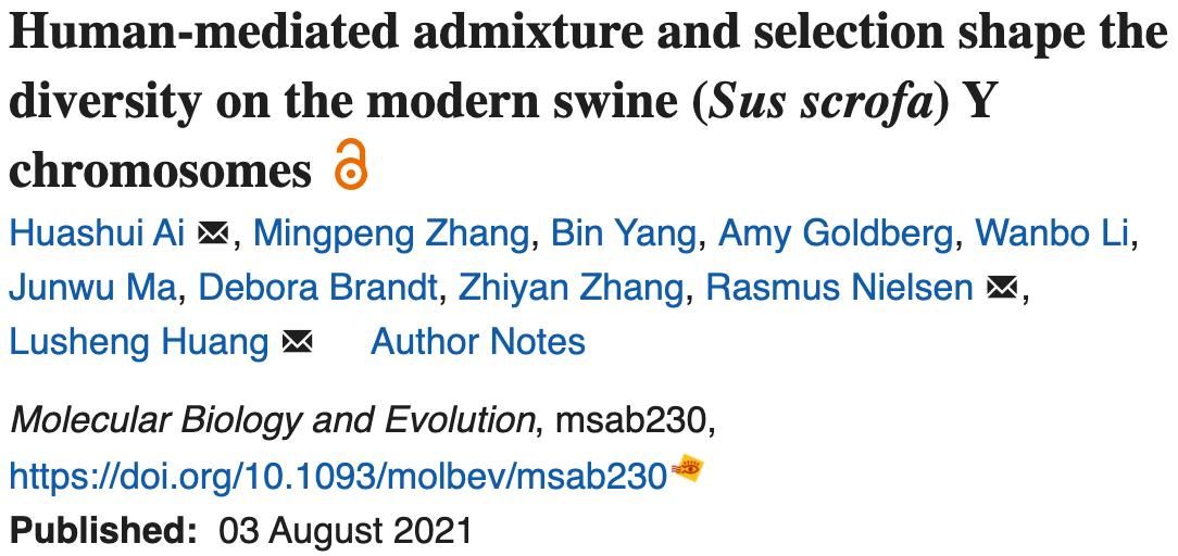 日前,公司猪遗传改良与养殖技术国家重点实验室黄路生院士团队与加州大学伯克利分校等单位合作在《Molecular Biology and Evolution》(IF=16.24)发表题为“Human-mediated admixture and selection shape the diversity on the modern swine (Sus scrofa) Y chromosomes”的研究论文,系统阐述了人类介导的渗入和选择塑造现代家猪Y染色体的多样性以及从父系遗传角度揭示猪的演化历史。黄路生院士、学校首席教授艾华水研究员和加州大学伯克利分校Rasmus Nielsen教授作为共同通讯作者、2017级博士研究生张明鹏为共同第一作者,2026世界杯官网作为第一通讯作者单位。