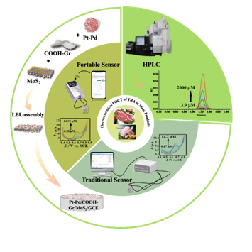 基于以上背景,本研究采用基于迷你手掌型恒电位仪与智能手机的便携式无线智能电化学传感器用于TRA的快速灵敏检测,同时通过高效液相色谱法(HPLC)进行方法验证,并与基于大型恒电位仪与台式电脑的传统电化学传感器对比,该传感器在线性范围0.55 - 14.9 μmol/L具有良好线性关系,检测限(LOD)为0.44 µmol/L,可成功实现畜禽产品中TRA的廉价便携式智能快速灵敏检测。该方法不仅为便携式无线智能传感器提供了应用新方向,也为畜禽饲料和畜禽产品中有害物质随时随地快速灵敏检测提供了新思路。