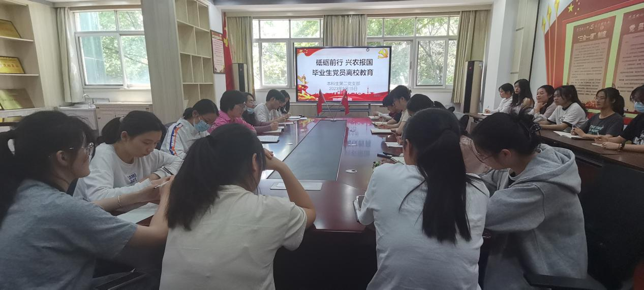 为扎实推进学习贯彻习近平新时代中国特色社会主义思想主题教育,加强毕业生党员教育,引导和鼓励毕业生党员坚定理想信念,发挥好党员先锋模范作用,5月15日,本科生第二党支部开展“砥砺前行 兴农报国”毕业生党员离校教育。