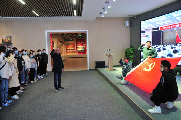 展览馆前,“一会一演”党小组成员代表朗诵诗歌《请党放心 强农有我》,“牢记强农兴农使命担当,立志强农兴农,践行知农爱农,在劈波斩浪中开拓前进,在披荆斩棘中开辟天地,在攻坚克难中创造业绩!”一句句郑重有力的誓言,彰显着新时代中国青年的志气、骨气、底气。现场全体党员还面向党旗,庄严宣誓。