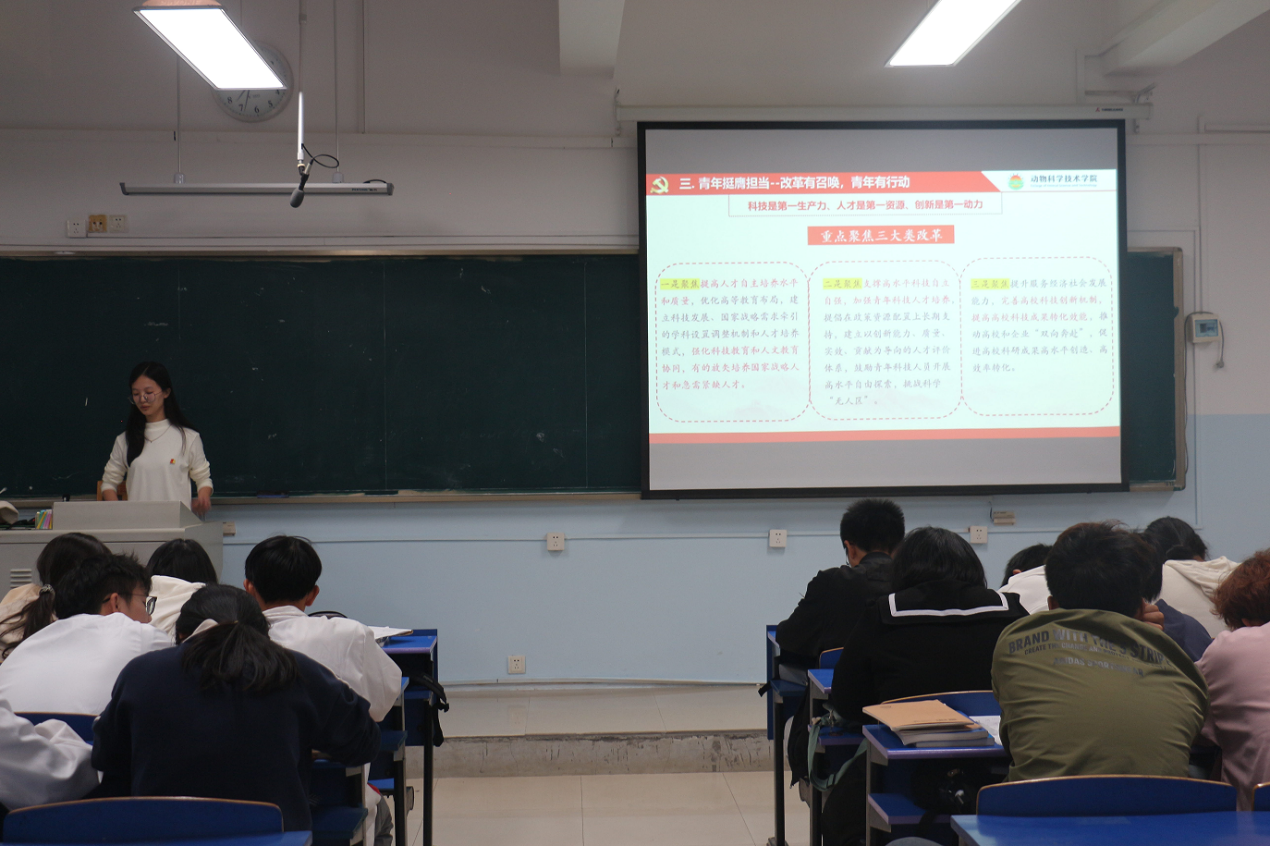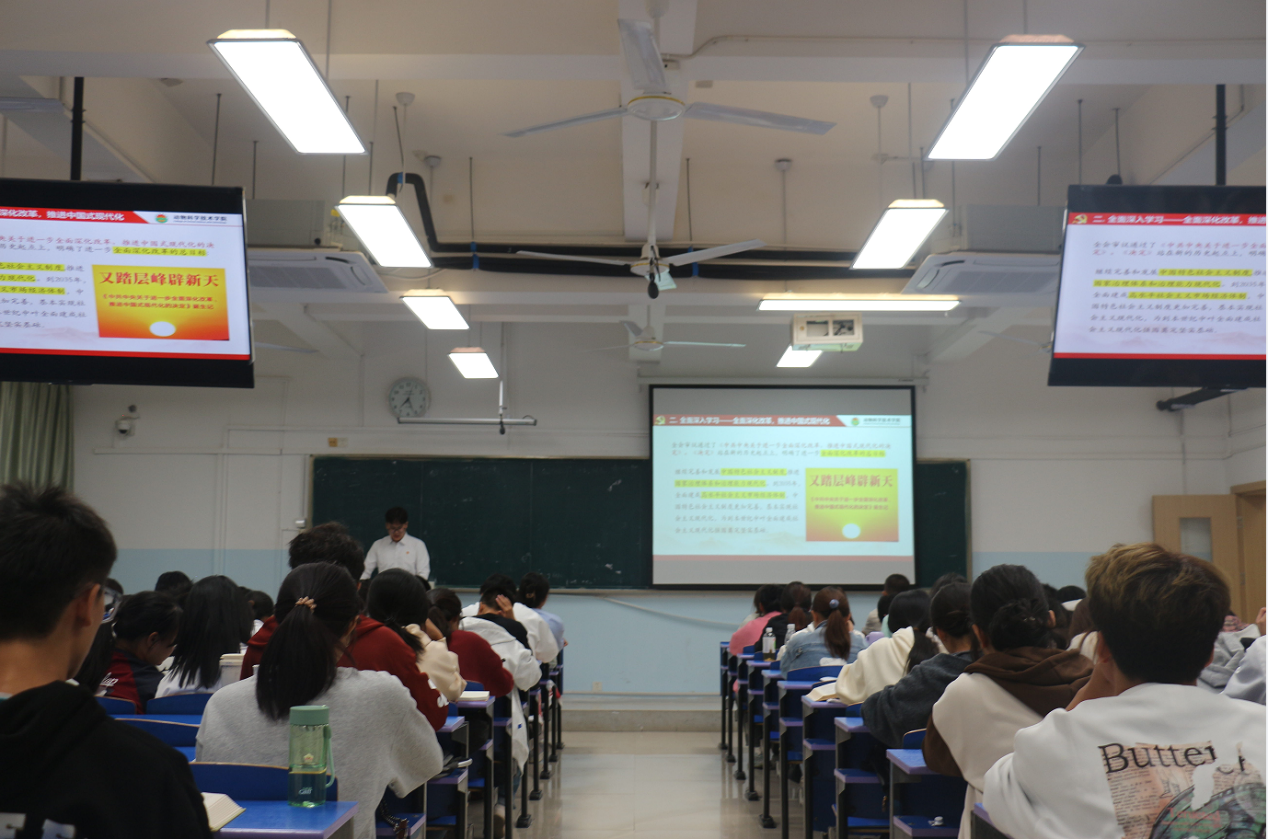 “青年兴则国家兴,青年强则国家强”。站在新的历史起点上,让我们紧密团结在以习近平同志为核心的党中央周围,学习贯彻党的二十届三中全会精神,以一往无前的奋斗姿态书写属于我们这一代人的壮丽诗篇!宣讲团成员巧妙运用多媒体,让理论叙述更加生动直观,设置互动环节,邀请在场学子参与其中,让理论学习变成“沉浸式”体验,提升了宣讲效果,拉近了与青年学子的距离。