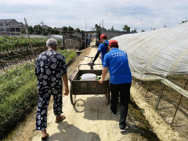 伴着蝉鸣,实践队走进田间地头,了解群众需求,为农民办实事。队员们戴着帽子、拿起锄头、背上水壶、握着剪刀进入大棚,施肥、锄草、打理蔬菜,在广袤的田野里,蓝色的身影若隐若现,成为一道别致的风景线。在体验灌溉、松土、采摘等劳作活动时,恰逢一位老人搬运新鲜采摘的农作物,队员们立马前去帮忙,推着三轮车运往到老人家中。老人与队员们唠家常,当谈到他家的蔬菜时,老人如数家珍,一脸喜悦。虽炎炎烈日,个个汗流浃背,但队员们望向田地里绿油油的蔬菜,都露出满意的笑容,深感自豪。实践队深入推进“为群众办实事”活动,用心用情用力解决农民问题,展现青年风采!