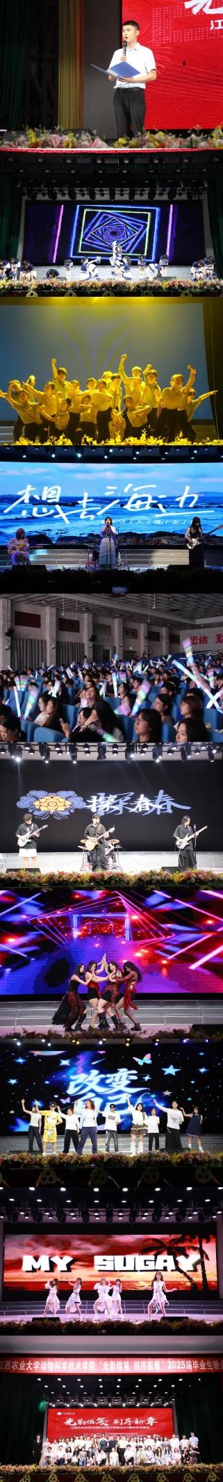 整场晚会分为《光影信笺》《夏至未央》《别序新章》三大篇章。《下一个天亮》《我们的明天》《夏至未至》和《像你这样的朋友》等曲目韵律十足,扣人心弦;《“橙风”破浪》《toxic》《改变自己》《smart》和《strategy》以铿锵鼓点搭配灵动舞姿,燃爆全场;《绳环奇术》《当考试还剩15分钟》和《我与江农的四年之约》幽默诙谐,掌声不断;乐队《想去海边》和《探春TANCHUN》用深情嗓音传递信念,收获阵阵喝彩。最后,教师合唱《明天会更好》为晚会画上圆满句号。