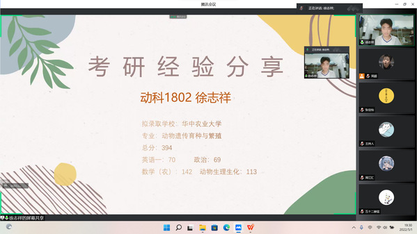 会上,考研经验分享人结合班级其他同学的学习经历凝练考研经验,从学校选择、复习安排、心态调整、时间规划等多方面向学弟学妹们传授“真经”。各分享人都提到科研经验的重要性,有实验经历、科研能力强的同学在复试中更占优势,引导大家在校期间要主动参加实践活动、科学研究。针对英语、政治、专业课等考试科目的复习经验展开深入讲解,鼓励大家要未雨绸缪、准确定位。互动环节,同学们针对如何选择考研学校、专业,四六级成绩对考研是否影响等问题进行提问,各分享人有针对性地对提问给出建议和意见。疫情防控要求下的线上交流会虽隔着屏幕,但同学们的学习热情丝毫不减。